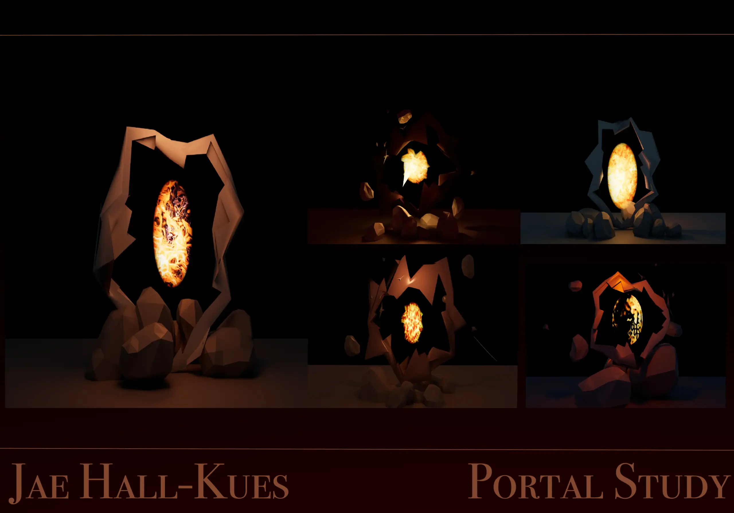 A series of portals inspired by the video gameĀ Diablo. I enjoyed the look of a fire aesthetic with rocks floating around some of the portals.