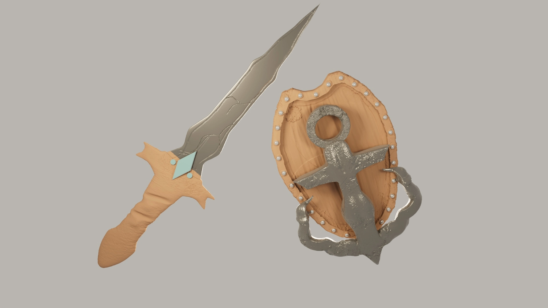 A high poly render of a swortsword and an anchor shield from my sculpting class! Rendered in Maya and textured by me.